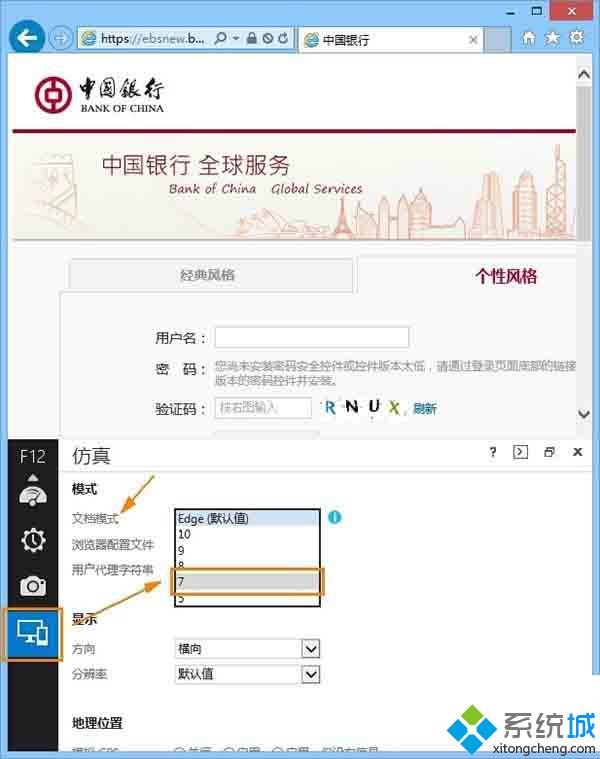 1、首先在IE11中按下F12键打开"开发人员工具",将左边的菜单切换到最后的"仿真"区域;然后在"文档模式"中选择"7"即可IE兼容性视图模式;