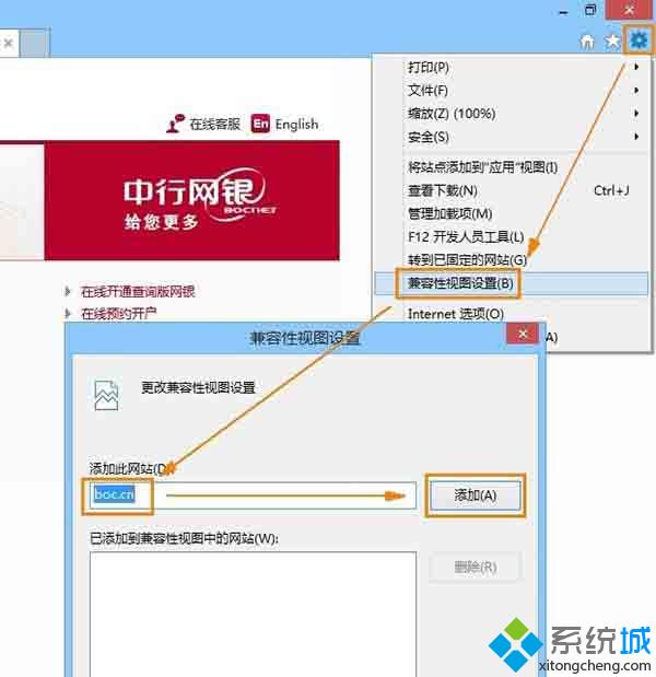 此方法以后每次登陆中国银行网银都要先这样操作一次,那么我们还可以将该网址加入到兼容性视图列表,就一劳永逸了。具体操作方法如下: