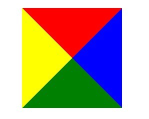 如果将盒容器的width和height设置为0,并为每条边设置一个较粗的width值和彼此不同的颜色,最终会得到四个被拼接在一起三角形,它们分别指向不同的颜色。